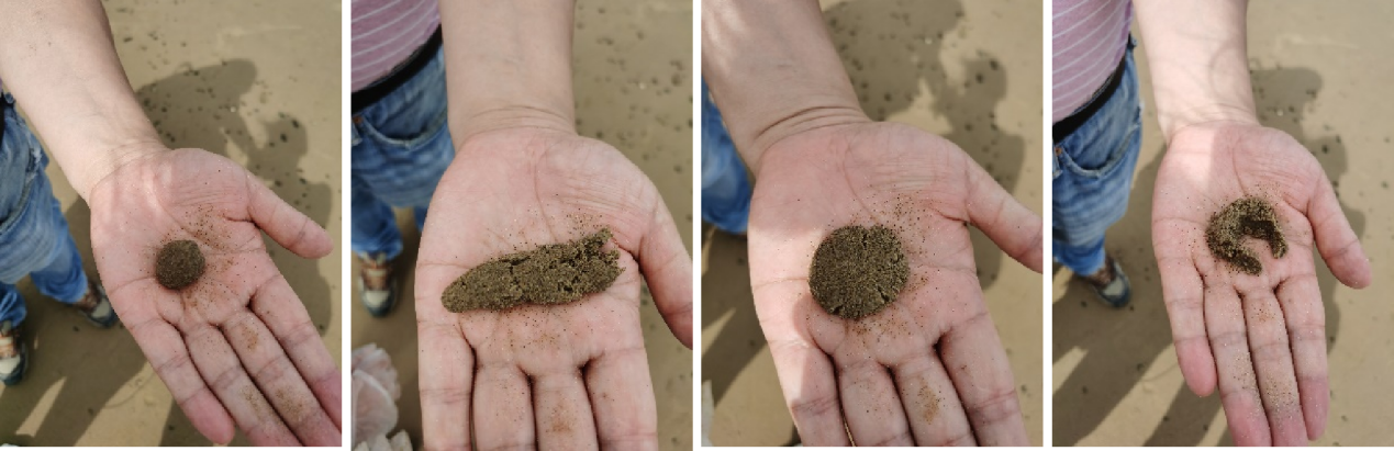 【观察】沙砾能否捏成圆球?圆球拍击是否会拍散?有无裂缝?沙砾能否搓成长条?能否弯曲成圆?为什么会出现这些现象?