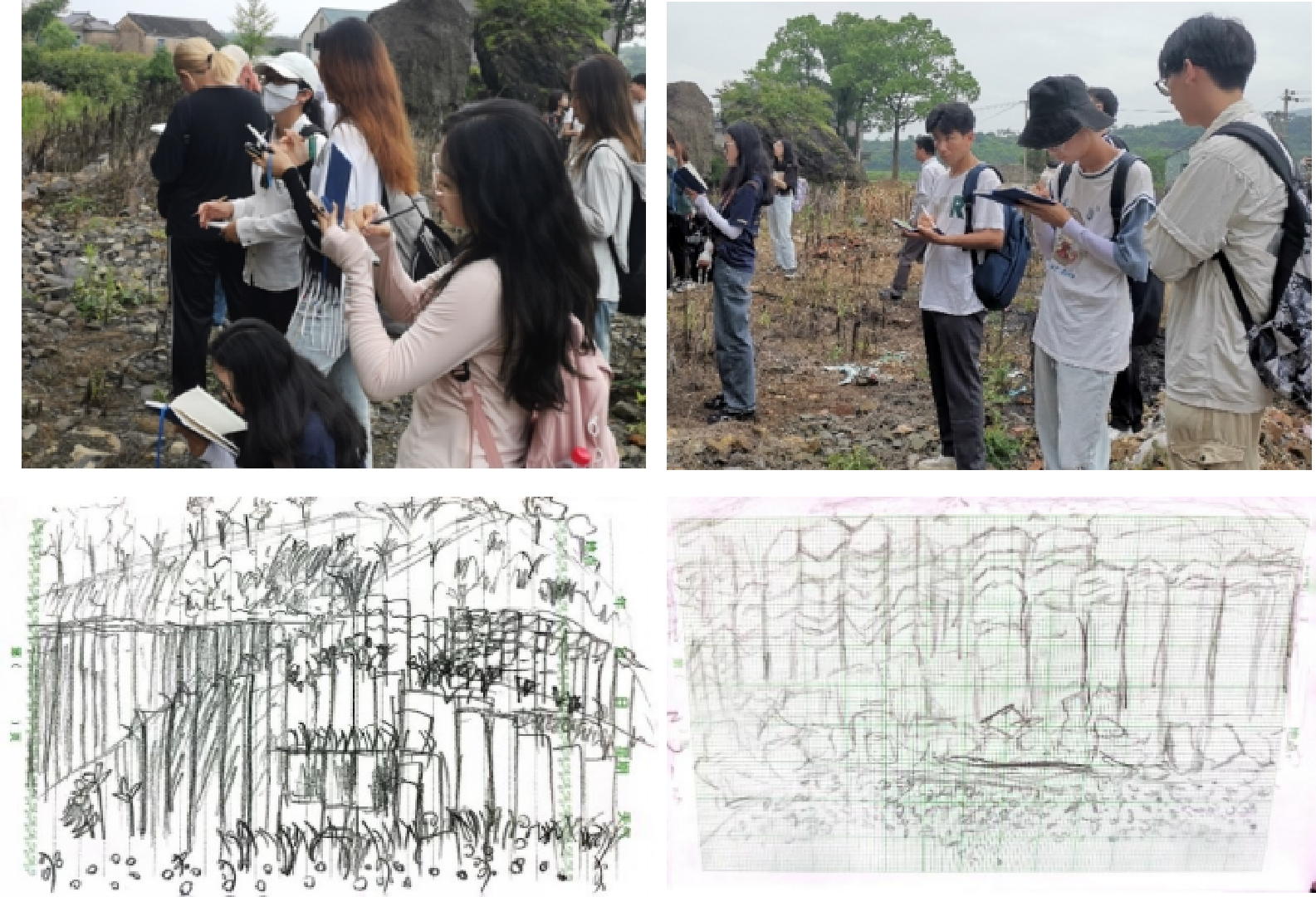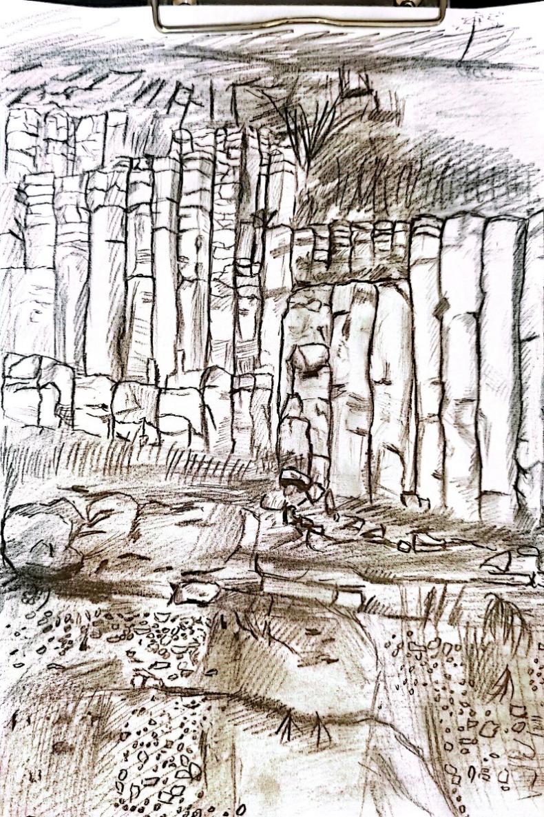 观察完玄武岩的柱状节理,我们发现柱状柱状节理的顶部以及底部都有土壤分布,特别是在靠近底部区域的剖面尤为特殊,在听完老师们的生动讲解,我们用自己的笔触绘制出古河漫滩剖面。即使对于绘画,我们没有太多基础,但在凸显地貌的特点上,我们可是认真的。