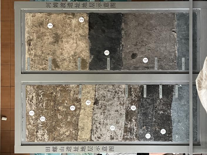 通过场馆讲解员和王丹老师的讲授,我们认识到原来直径距离只有7公里的田螺山与河姆渡在7000多年前可能就有联系,并且交往工具是船,通过两个地层的对照,得出田螺山遗址内部具有最新地层,所以其划分得更加细致。