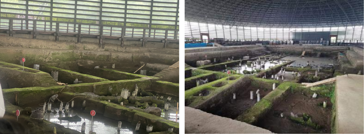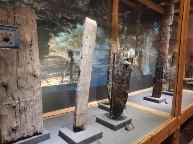 在遗址挖掘现场的大棚内,每一个数字标注的地方都是先人居住的证明,有代表村庄的围墙、代表独木桥的长木材、将中国饮茶文化往前推移两三千年的茶树根,还有独木舟、木质磨盘、夏子科等的缩影。