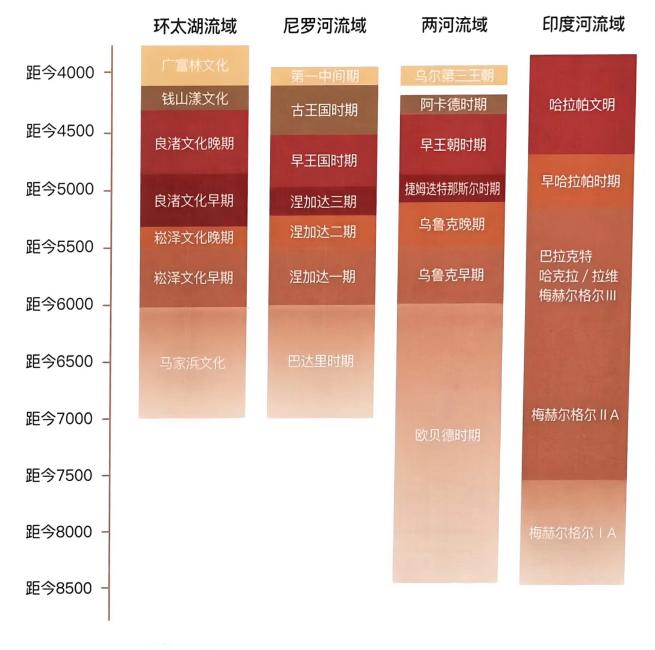 良渚文化 | 距今5300-4300年 | 农业发达,手工业生产体系化。以琮、璧、钺为代表的玉器系统达到了史前玉文化的顶峰,形成了玉礼制度。以神权、军权、王权为特点的政教合一的权力体制,显示出良渚文化已形成复杂的等级社会,以古城都邑和水利系统为代表的大型营建工程,表明良渚文化已进入成熟文明和早期国家阶段。 |