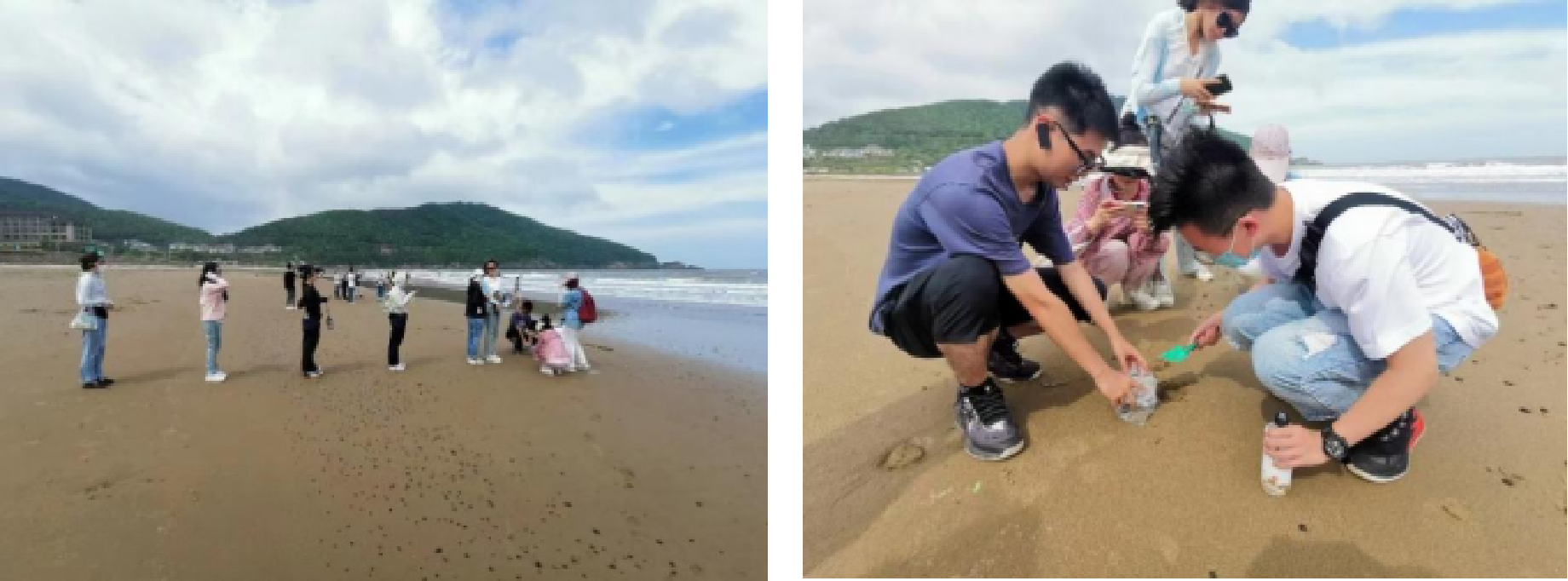 分组进行沙滩样品采集(各组起点相同,间隔距离不同,进行系统性样品采样工作)。同学们还进行了土壤性状实验,分别对不同区域的沙子进行揉搓、拍扁、弯曲等操作,观察其粒度、结构、松散程度。