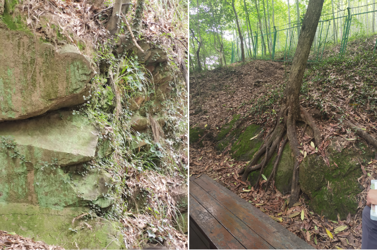 李亚龙老师为同学们讲解了佘山的地质构造,岩床、岩墙、岩基、岩珠等概念,岩石分类,如何描述岩层,地质作用等,指导我们利用地质罗盘对地层产状三要素(走向,倾向,倾角)进行测量。
