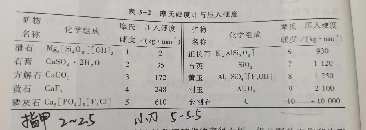 《地质学基础》P52 表3-2摩氏硬度计与压入硬度
