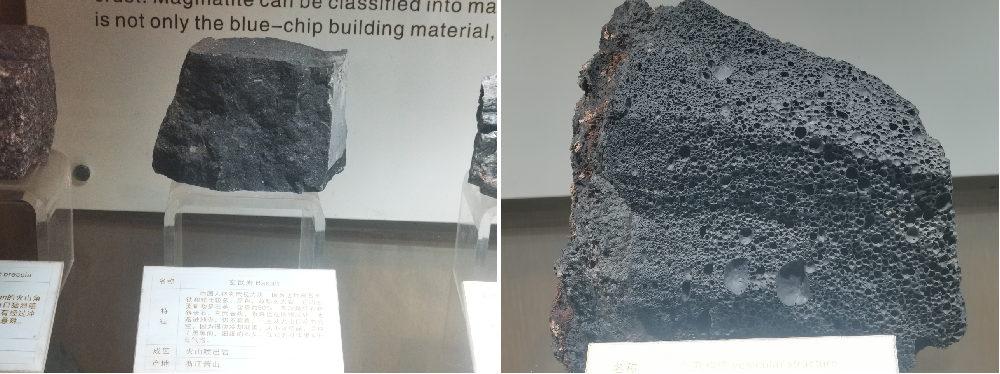 (2)喷出岩:是地下岩浆在内力作用下,沿地壳薄弱地带喷出地表冷凝而形成岩石,它的矿物结晶颗粒细小,有的有流纹或气孔构造,代表岩石就是玄武岩。