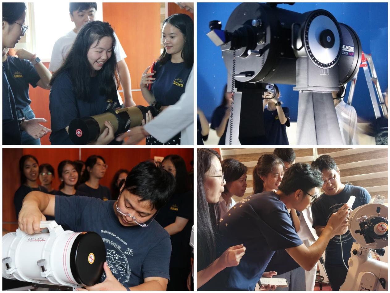 首先,陈宇新老师带领学生参观了天文活动室,包括中国古代星象图,三垣二十八宿,陈列的地球、月球、太阳以及我国古代的诸多天象模型。进入天文台后,陈老师用风趣幽默的语言向学生们演示了望远镜的组装方式,在富有趣味性的互动体验中,青年学子们了解了日珥镜、望远镜等天文仪器,近距离体验天文的乐趣。