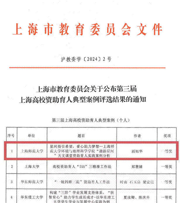 近期,在由上海市教委开展的第三届上海高校资助育人典型案例评选活动中,太阳成辅导员涌旭华老师撰写的《星河指引希望,爱心助力梦想——太阳成集团tyc33455cc官网太阳成集团tyc33455cc官网“遨游星河”天文小课堂资助育人实践案例分析》案例获评一等奖。