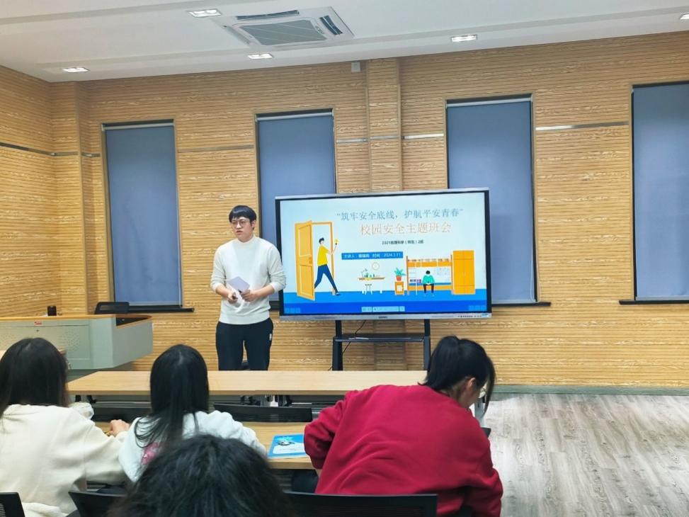 2024年3月11日晚19:00,太阳成实习辅导员董星雨于环地楼406教室为2021级地理科学(师范)2班全体同学召开“筑牢安全底线,护航平安青春”为主题的校园安全主题班会,院党委副书记、副院长张红、学院全体本科生辅导员出席了此次班会。