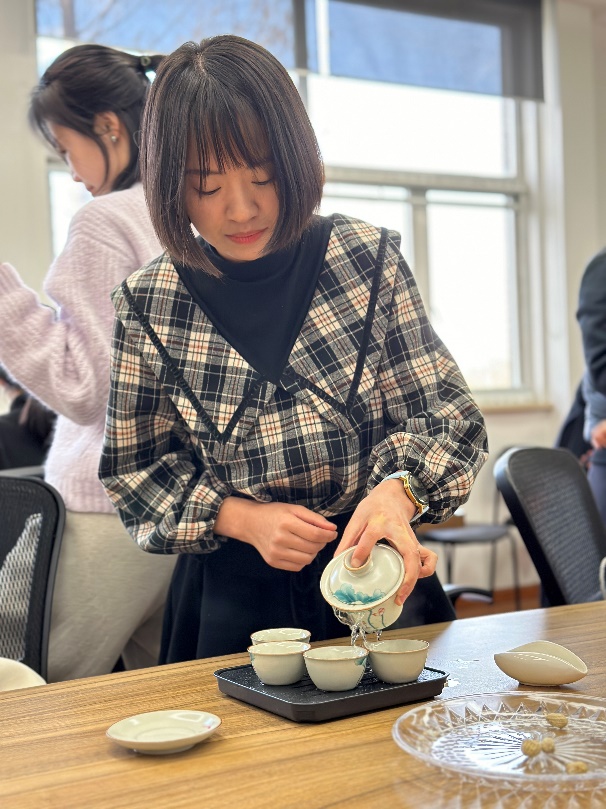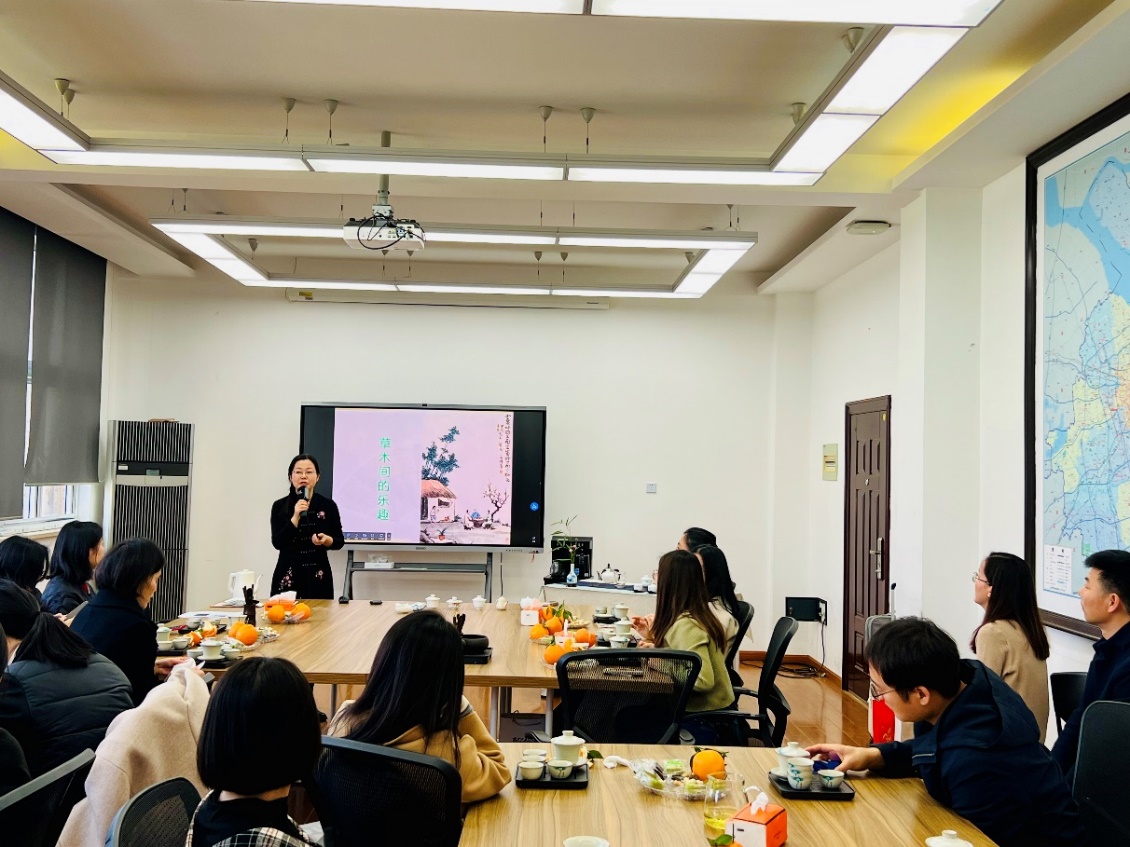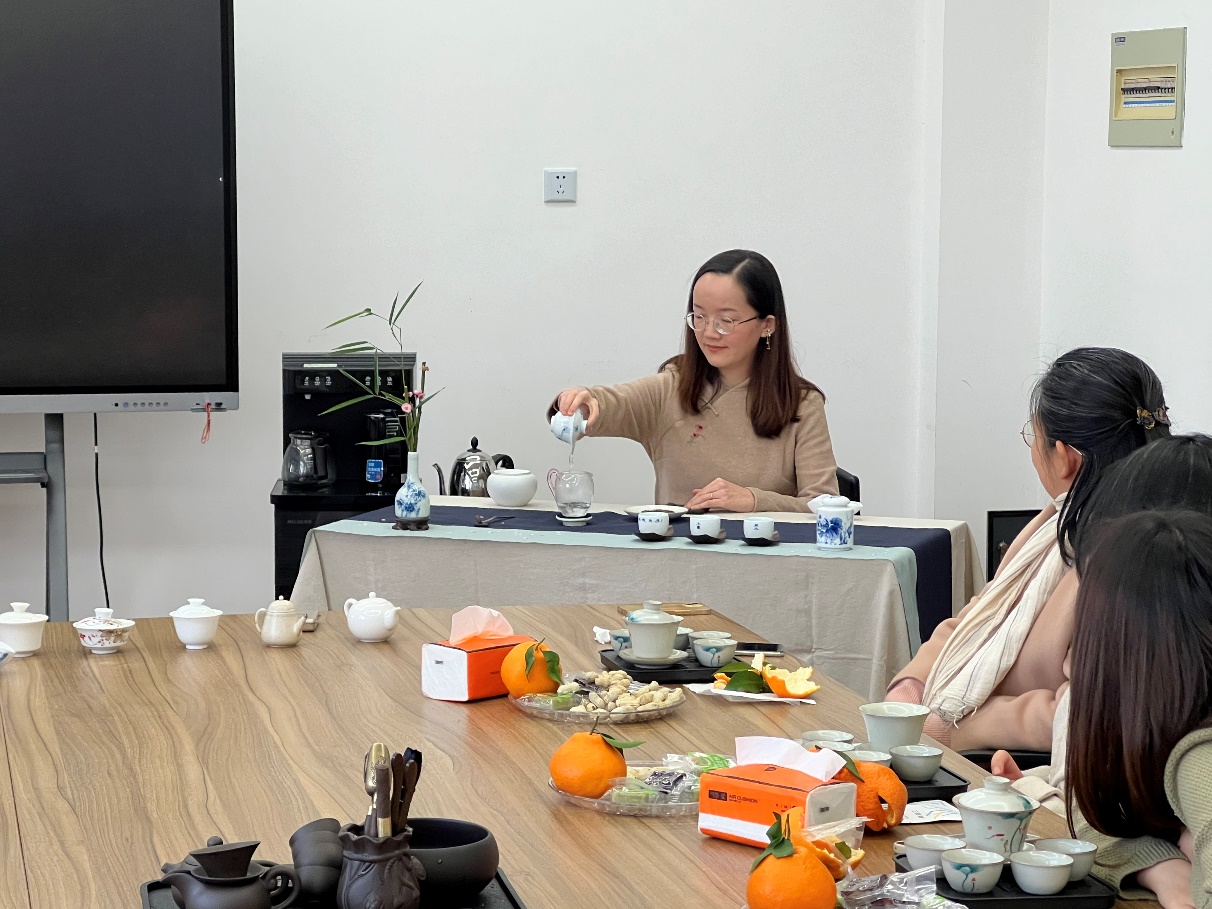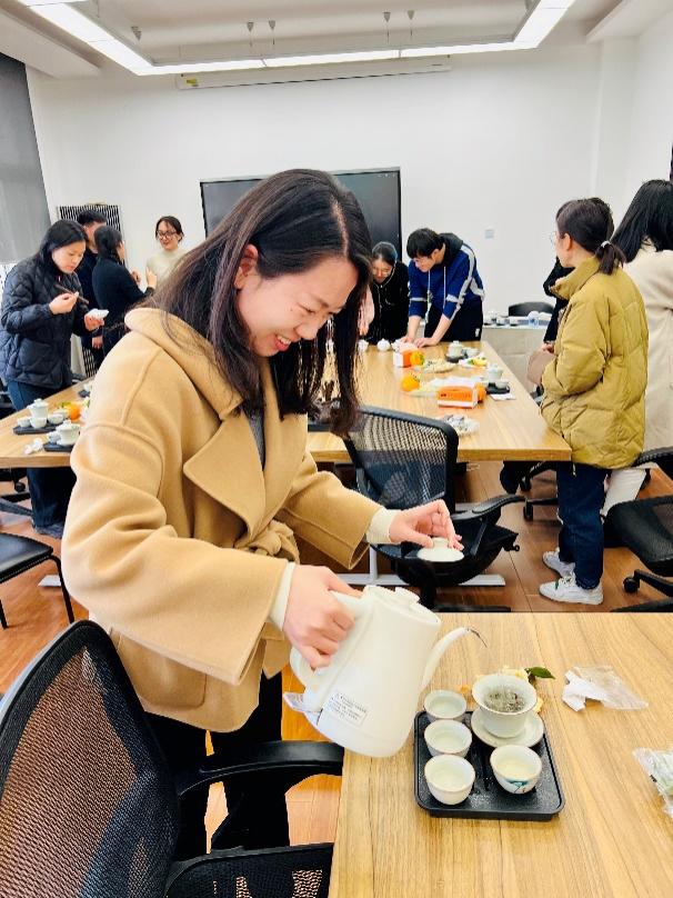 本次活动邀请到上海旅游高等专科学校的朱宁副教授(二级茶艺师/四级评茶员)讲解茶艺和交流。伴随着舒缓的音乐、精美的茶盏,茶艺培训师亲身示范了中华茶艺过程、讲解了茶文化,带领大家感悟中华茶的品种与内涵。教师们热情体验,品茗间,大家放松了身心、交流了感情、促进了友谊。