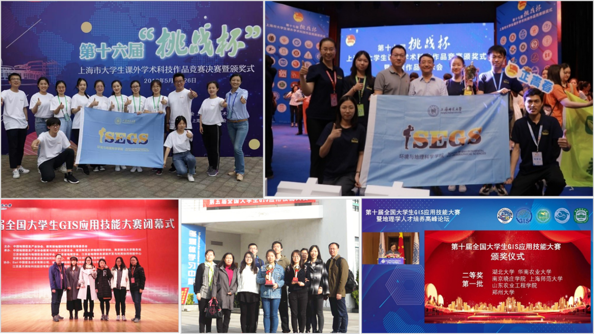 地理信息科学专业学科基础厚实,创新能力突出,形成“实践–竞赛–科研”闭环式教学培养模式,积极指导学生参加学科竞赛与科研项目,培养学生专业兴趣和研究能力。近年来,本专业学生多次在全国大学生GIS应用技能大赛、全国挑战杯比赛、上海市挑战杯比赛、上海市“知行杯”大学生社会实践大赛等国家级和省部级竞赛上获得特等奖、一等奖与二等奖等奖项荣誉。