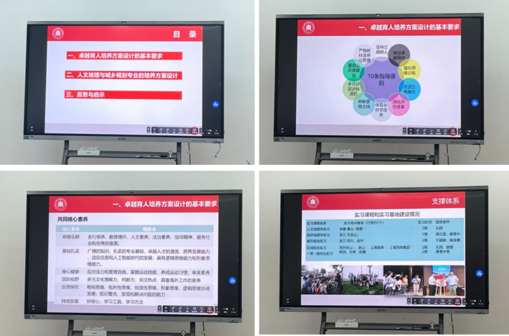 孔翔教授结合华东师范大学卓越育人培养方案,介绍培养方案设计的基本要求、培养目标、基于思维方式和差异性人才培养目标的课程体系、专业核心课程和专业选修课程、专业核心课程主辅教材、实习课程和实习基地建设等,并以人文地理与城乡规划专业(国家级一流本科专业建设点)为例讲述了国家一流本科专业建设的具体内容。孔翔教授指出要重视学生在德智体美劳方面的发展,培养具有全球视野、家国情怀、创新精神和人文素养,掌握人文地理学及相关学科的基本理论、知识和方法,具备较强的城乡规划与区域管理实践节能和一定科研创新能力的复合型人才。