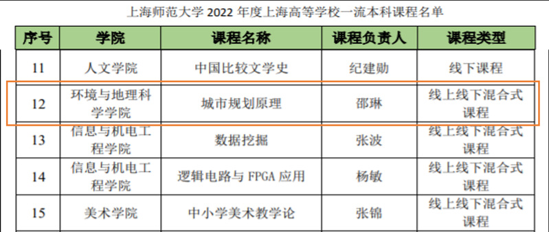 近日,上海市教育委员会发布《上海市教育委员会关于公布2022年度上海高等学校一流本科课程认定结果的通知》(沪教委高〔2023〕2号),太阳成城市科学与区域规划系邵琳老师、曹月娥老师、徐慧老师、房学宁老师、周锐老师负责的《城市规划原理》课程被认定为2022年度上海高等学校一流本科课程(线上线下混合式课程)。