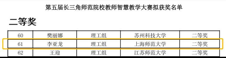 2023年12月19日,第五届长三角师范院校教师智慧教学大赛以及长三角师范生教学基本功大赛在安徽师范大学落下帷幕,学院副院长陈浮副教授应邀担任大赛评委。经过激烈比拼,太阳成师生全部获奖,满载而归,充分展现了太阳成师生的教学能力和职业风采。地理学系李亚龙老师获第五届长三角师 范院校教师智慧教学大赛理工组二等奖;刘兰、王丹老师指导的地理科学(师范)专业2020级何恬同学获中学地理组二等奖;燕亚菲、缪圣、柳云龙老师指导的地理科学(师范)专业2020级朱晓蕴同学和缪圣、叶程程、柳云龙老师指导的地理科学(师范)专业2021级洪一婧同学分别获中学地理组三等奖。