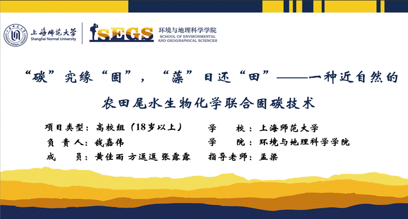 由孟梁老师带领的本科生团队钱嘉伟,黄佳雨、方逗逗、张露露4位同学参赛作品《“碳”究缘“固”,“藻”日还“田”——一种近自然的农田尾水生物化学联合固碳技术》荣获大赛“科技发明类”赛道一等奖。