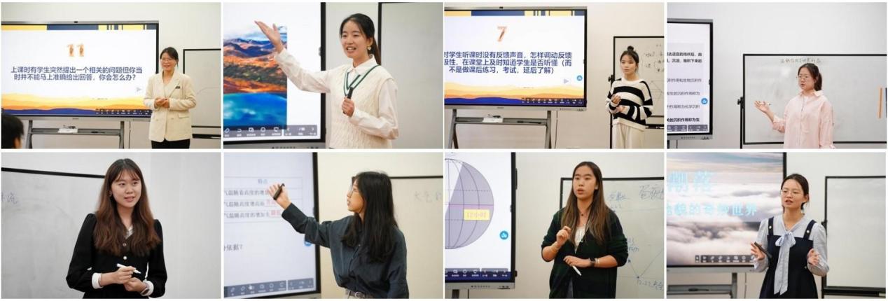 本次比赛分为初赛、决赛两个部分,覆盖教案撰写、教具制作、课件制作、板书板画、即兴演讲等多种形式,自2023年4月启动以来,共有25名学生参与,经评审8名学生成功入围决赛。决赛采用10分钟片段授课和即兴演讲的形式。选手们根据抽取的章节,对初高中地理课程的多个知识点进行了生动细致讲解。地理模具、课堂小实验、师生互动……各位选手认真准备、彰显风采。