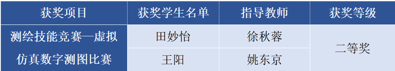 此次大赛采用选手线上参赛,评委线下评审的方式进行,共分为三个赛项,包括测绘技能竞赛、开发设计竞赛和科技论文竞赛。据悉,今年参赛学校和学生人数均创下了历届大赛规模之最,整体参赛学生数达到了5500余人。学院对此高度重视,由地球大数据科学系牵头组建参赛团队,最终选定地球大数据科学系徐秋蓉老师和学院实验员姚东京老师共同带领学生参赛,参赛项目为测绘技能竞赛赛项中的虚拟仿真数字测图比赛和无人机航测虚拟仿真比赛。参赛师生们在暑期认真备战,以积极饱满的精神状态投入比赛过程。根据比赛要求,参赛选手在虚拟场景下根据地形需要,灵活应用GPS、全站仪、无人机测绘设备,进行野外数字采集,对中、整平、照准、绘图,进而呈现一副完整的数字地形图。经过激烈竞争,2020级地理信息科学田妙怡、2021级地理信息科学王阳同学脱颖而出,在测绘技能竞赛中荣获二等奖2项。
