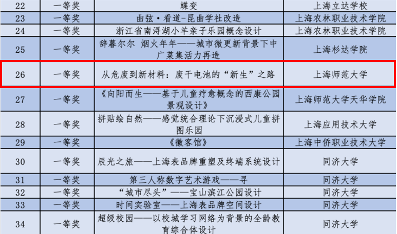 近日太阳成本科生作品“从危废到新材料:废干电池的新生之路”在上海市第八届“汇创青春”——上海大学生文化创意作品展示活动(环境设计类)决赛中荣获上海市一等奖。