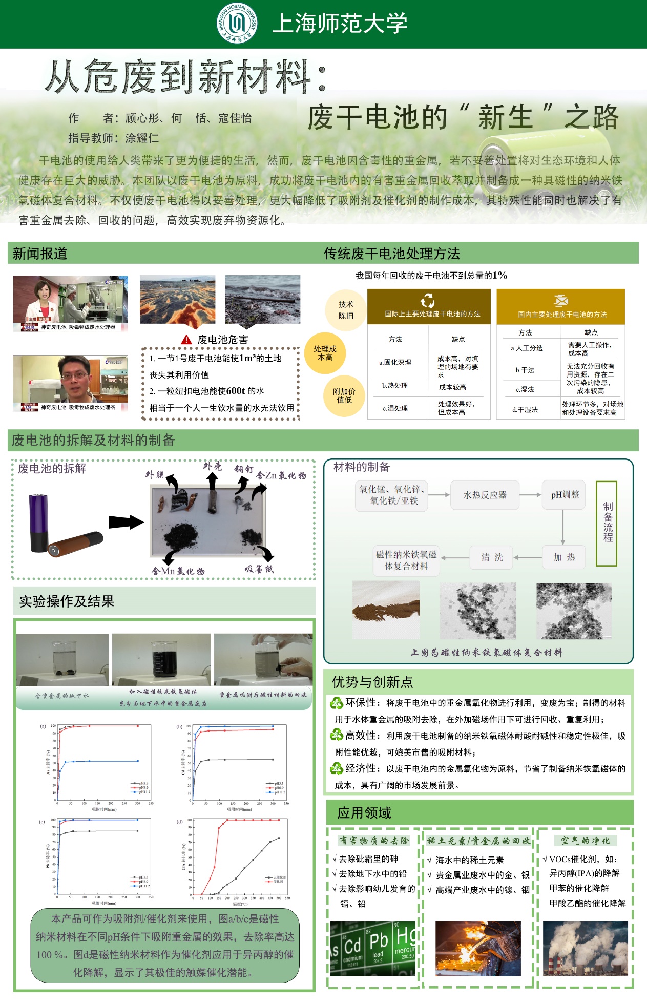 太阳成2020级环境工程专业本科生顾心彤(中),2020级地理科学(师范)专业本科生何恬(左),2019级环境工程专业本科生寇佳怡(右)共三名本科生在我院涂耀仁老师的指导下组队参加。该项目以废干电池为原料,除了成功将废干电池内的有害重金属萃取回收外,更进一步将其制备成一种具磁性的纳米铁氧磁体复合材料,用于有害物质(如Pb、Cd、As、Sb)的去除、贵金属(如Au、Ag、Pt、REE)的纯化与回收,以及挥发性有机物(如异丙醇、苯、甲苯、乙基苯、二甲苯)的催化。此外,该技术不仅可将废干电池中的重金属萃取制备成高价值的吸附剂或催化剂,在外加磁场的作用下亦能进行材料的快速和高效回收;该产品原料从废干电池的回收拆解获得,不仅让为数众多的废干电池得以妥善处理,更大幅降低了吸附剂或催化剂的制作成本,为资源回收再利用的理念开启了一扇大门。