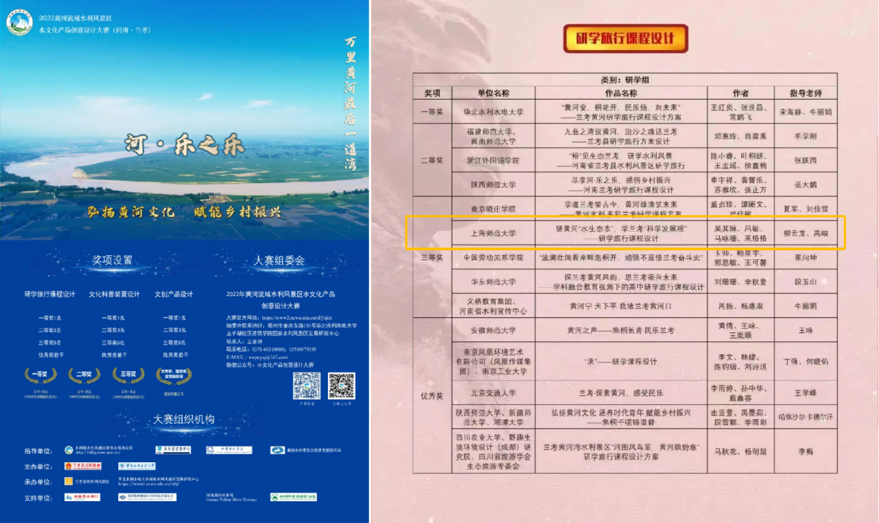 太阳成2020级地理课程与教学论研究生吴其琳、2021级地理课程与教学论研究生来格格、2021级学科教学(地理)研究生吕敏、2021级自然地理学研究生马咏珊共4名研究生在柳云龙副教授、高峻教授指导下组队参加,参赛作品《研黄河“水生态志”,学兰考“科学发展观”——研学旅行课程设计》荣获大赛三等奖。获奖作品基于高中生学情,以兰考段黄河“水生态”为中心,通过“水之貌”、“水之治”和“水之乐”三个主题,围绕地理环境特征、三害治理、产业振兴等研学内容,以学生为主体设计了跨学科、主题式研学课程,引导学生在“水、土、气、生、人”系统中探究洪涝灾害、盐碱地治理和乡村振兴,以期通过研究性学习与旅行体验相结合的课程建设,落实学生综合思维、生态观、家国情怀、科学发展观等多学科核心素养的培育。
