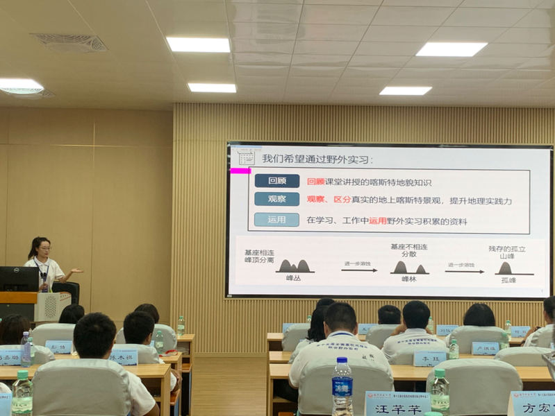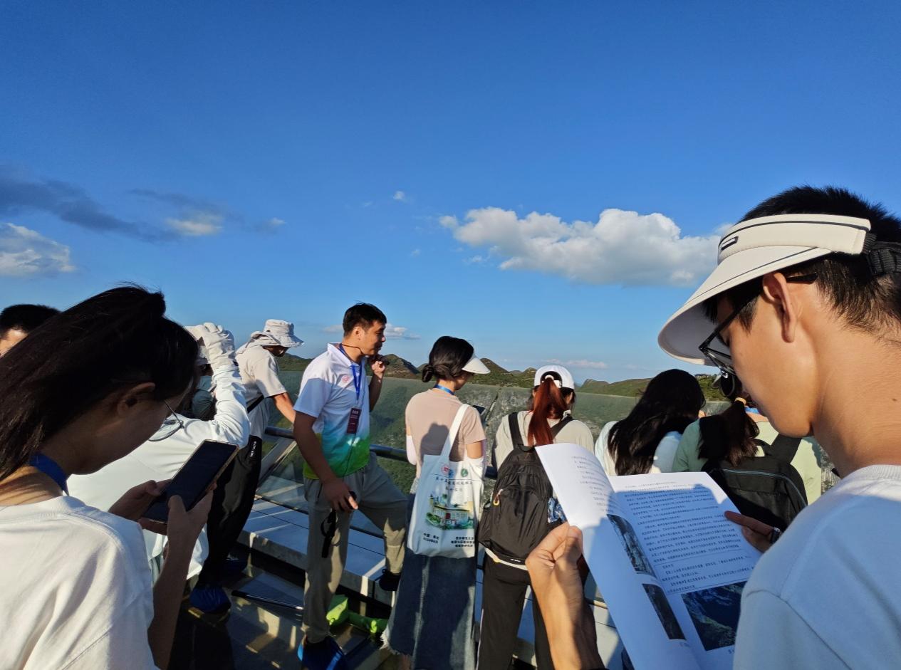 天坑是喀斯特地貌中的一种重要形态,此次野外实习点位就包括大石围天坑。在玻璃栈道观景台,来自南宁师范大学的卢炳雄老师讲解大石围天坑的形成过程与成因、分析该区域地下河系统与地质构造运动,并通过提问引导同学们思考天坑形成与地下河的地理关系。