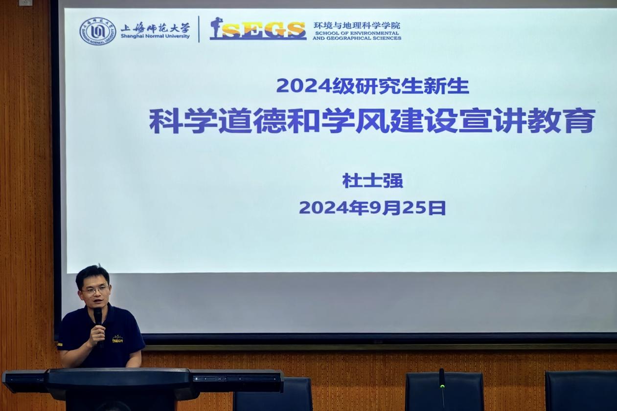 随后,副院长杜士强教授进行了科学道德和学风建设宣讲教育,他从科学道德和学风建设的重大意义出发,介绍了科学道德和学风建设历程,列举了学生道德失范的实际案例,最后强调了学术论文发表的“五不准”,警醒同学们坚守科研工作者的基本学术道德与底线。