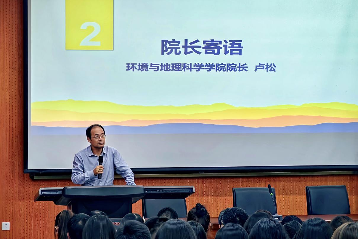 伴随着庄严的国歌声,开学典礼拉开帷幕。典礼上,太阳成集团tyc33455cc官网院长卢松首先代表学院全体师生向2024级新生致以最诚挚的欢迎。在回顾学院的由来历史、学院学位建设、人才培养以及各方面的优势性进展后,卢院长从“用脚步丈量祖国大地”、“用内心感应时代脉搏”、“用学识培养宏大视野”三个方面殷切寄语新生同学,希望各位同学在环地学院这个温暖大家庭中,不仅能实现自我成长,还能拥有充实且满足的生活体验。