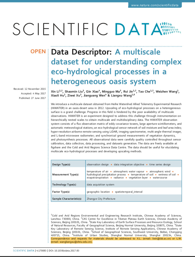 该论文系统介绍了黑河生态水文遥感试验(Heihe Watershed Allied Telemetry Experimental Research, HiWATER)于2012年在黑河流域沙漠-绿洲区域观测的多尺度科学试验数据集,论文涉及到的103条数据集全部在黑河计划数据管理中心网站公开共享。王亮绪副研究员负责了国家自然科学基金委“黑河流域生态-水文集成研究”重大研究计划中科学数据共享与出版的技术研发。HiWATER试验以具有高寒与干旱区伴生的鲜明特征的黑河流域为试验区,其总体目标是显著提升对流域生态和水文过程的观测能力,建立国际领先的流域观测系统,提高遥感在流域生态-水文集成研究和水资源管理中的应用能力。