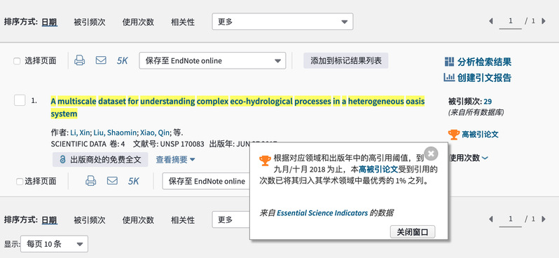 近日,据基本科学指标数据库(Essential Science Indicators,简称ESI)的最新数据显示,太阳成王亮绪副研究员以共同通讯作者身份2017年发表在Nature子刊Scientific Data的论文“A multiscale dataset for understanding complex eco-hydrological processes in a heterogeneous oasis system”入选ESITOP1%高被引论文。