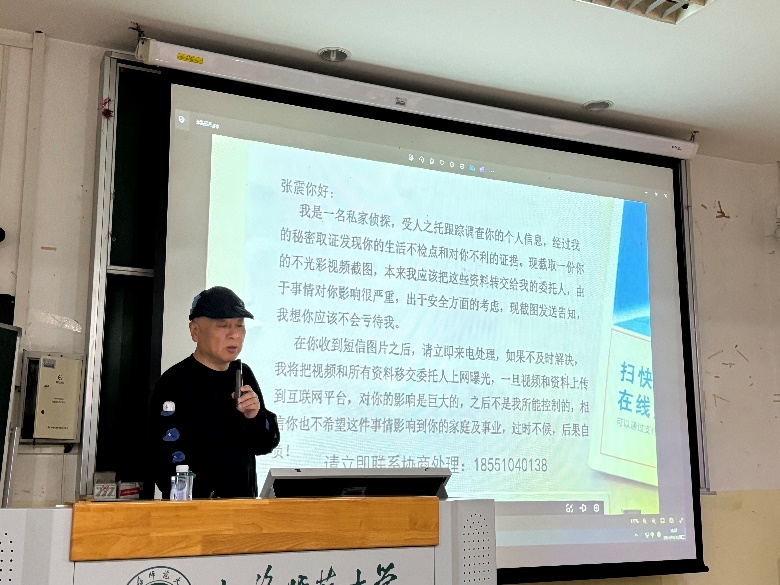 首先,张警官分析了近年来上海市各高校诈骗案件的基本规律,并深入剖析了较多发案件的类型和特点,他以极丰富的真实案件为同学们开展案例教学,如:游戏虚拟物品交易、网络兼职、冒充熟人、校园贷等诈骗类型,诈骗手段之繁复让人瞠目结舌。
