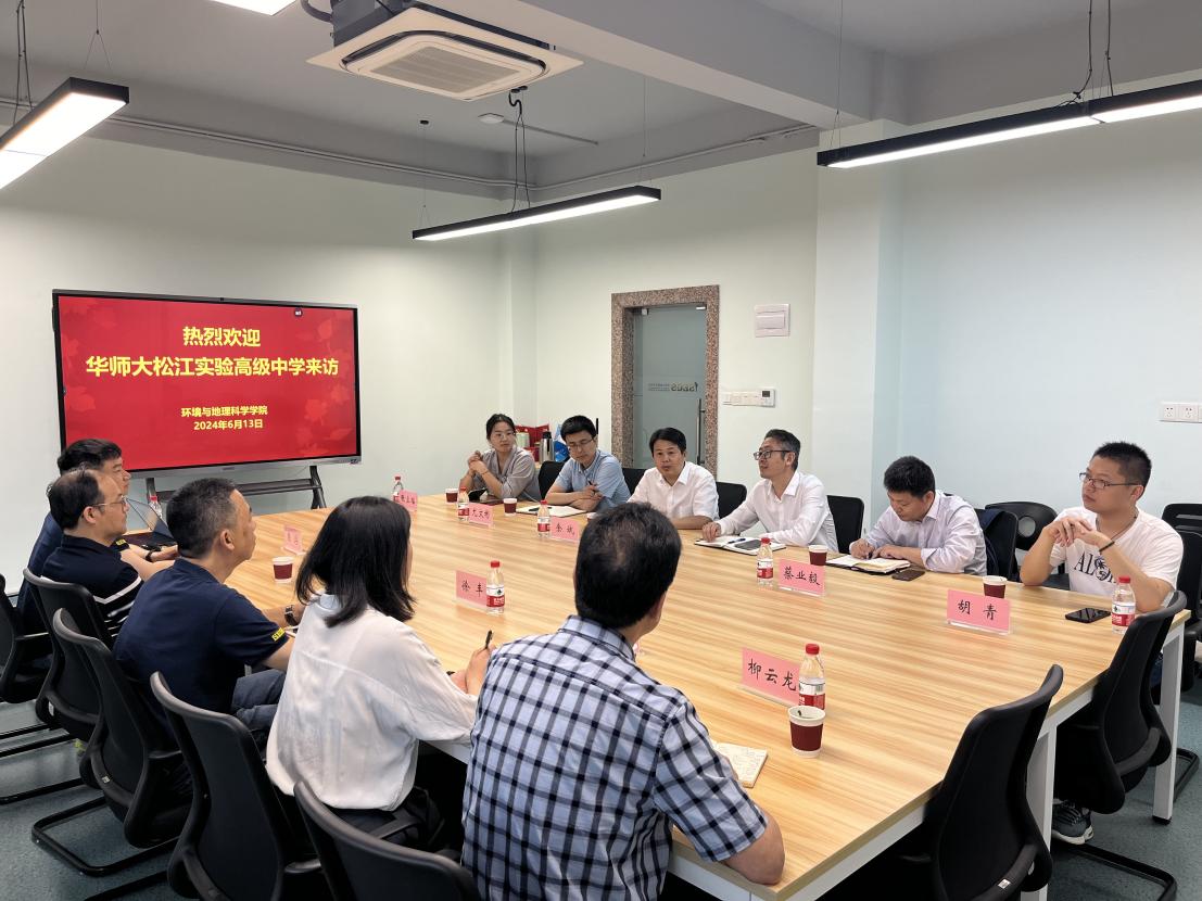 2024 年 6 月 13 日,2020 级课程与教学论专业校友胡青随同华东师范大学松江实验高级中学校领导莅临太阳成。学院党委书记徐丰、院长卢松、院党委副书记张红、本科教学副院长陈浮以及系主任柳云龙共同参与了此次座谈活动。双方分别对各自的发展状况进行了详细介绍。与此同时,太阳成阐述了师范生的培养情况,松江实验高中则介绍了对地理教师的招聘要求。最终,双方就未来的共创共建达成了一致意见。