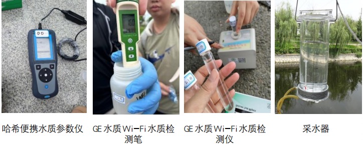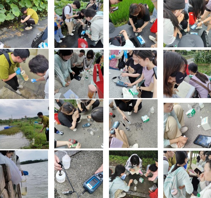 实习第二天,在段艳平老师的带领下,同学们在国家野外科学观测研究站附近进行水质采样检测。本次野外实习以小组为单位,分别对荷花池、谢庄港桥、鱼塘、大莲湖4个地方的水进行采样,并测量水温、DO、电导率、ORP、pH、SS、色度、透明度等指标。