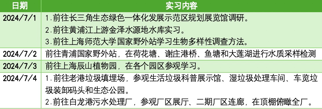 本次实习主要涉及区域为青浦区、松江区和浦东新区,区域分布与日程安排如下图表:
