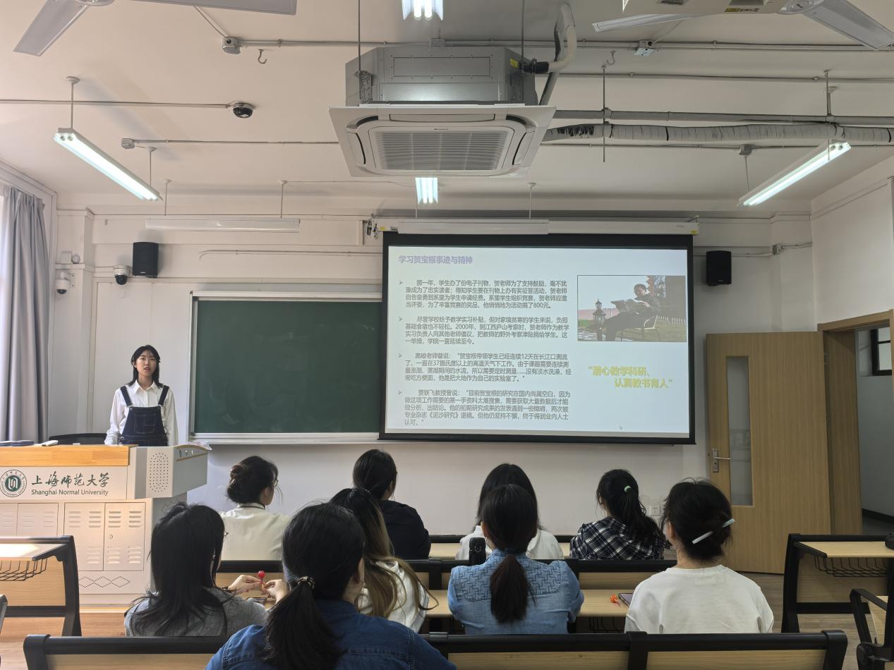 今年新生入学之初,宝根师德师风研习社把贺宝根烈士的事迹搬到了全校的舞台上,5100余名本科新生通过现场观看和视频直播的形式了解到了贺宝根烈士的事迹。社团原创的《学做人师》的舞台剧于今年上海师大“开学第一课”上进行了表演展示,演员们生动地演绎了贺宝根烈士生前与学生互动的场景并还原了他舍生救学生的英勇事迹,给台下的观众留下了深刻印象,无不对贺宝根烈士肃然起敬。