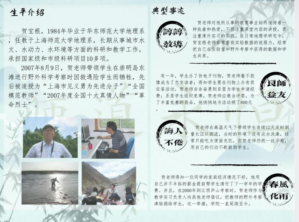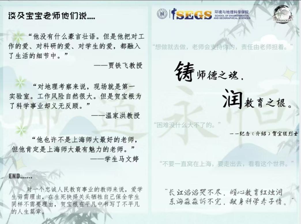 社团成员整理总结了历年来关于贺宝根烈士的资料,利用图文信息、视频资料,配合贺宝根烈士的同事、学生亲口讲述的内容,进行归纳、排版、设计,制作出宣传册一份和系列海报一份,并在学院活动中进行分发、展示,广泛传播宝根老师优秀的师德师风,传扬“敬业爱生”的宝根精神,增进同学们对贺老师的认识。