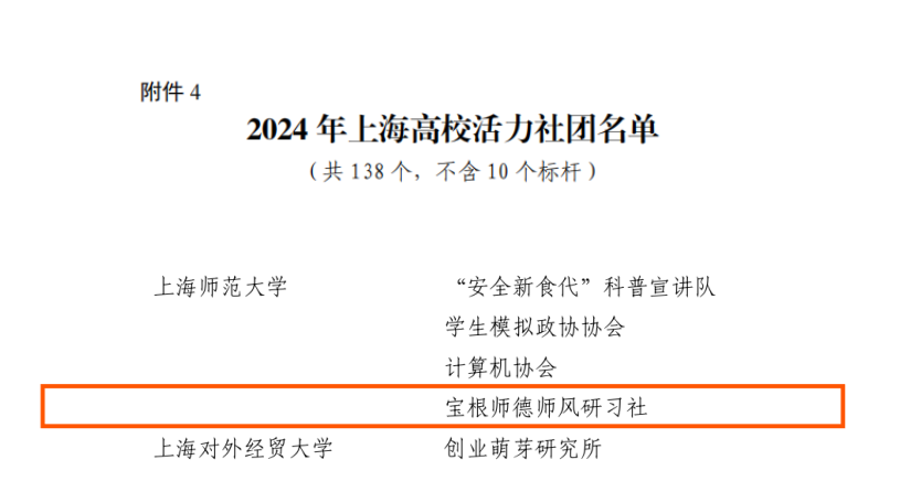 近日,共青团上海市委员会、上海市教育委员会联合发文,对2024年上海高校、高中阶段学校活力团组织、活力社团、团干部典型遴选活动中涌现出的先进典型进行表扬。在这份荣誉榜单中,太阳成集团tyc33455cc官网宝根师德师风研习社赫然在列,荣获2024上海高校活力社团称号。
