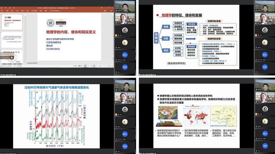 鹿化煜教授从地理学的定义切入,通过解读地理学的核心概念、三大分支学科内容,带领大家思考地理学的特征、使命和发展。他认为,地理学是认识地球系统过程和人地关系的支柱学科,是支撑国家重大战略需求的基础学科,地理知识和能力已经渗透到当今社会的方方面面。随后,鹿化煜教授以大量的研究数据为依据,聚焦气候变暖问题,并指出造成这一气候变化的主要原因是人类活动,特别是温室气体的大量排放。由于气候变暖将对海平面、冰川、海冰、雪盖、冻土以及自然生态系统和人类健康等都会产生严重影响,且这类影响往往是难以承受的、不可逆转的、持久的。作为地理学人,应当勇担科学使命,从全球变化“命运共同体”的高度上,为环境保护贡献智慧和力量。最后,鹿化煜教授提出,国家和社会发展要求全面提升地理学人才培养能力,需要引导更多青年“有志于人生地理学研究”,促进人才培养“量”“质”双提升。