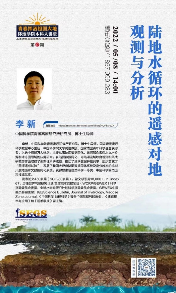 陆地水循环是驱动地球系统中各种物质能量与转化的核心动力之一。陆地水循环过程的变化会影响到水资源利用、干旱洪涝、水土流失、生态退化等一系列有关国家重大战略需求的热点问题。遥感卫星手段可以进行大范围、长时间和系统性的观测,为科学家们提供了新视角和新思维,极大推进了对水循环过程的认识和理解。此次邀请李新教授主讲本科生大讲堂,旨在进一步引导青年学子关注地球系统科学的发展动态,在“科学研究的非常时代”夯实专业基础,把握科技发展机遇期,迎难而上,以青春智慧探索科学前沿。