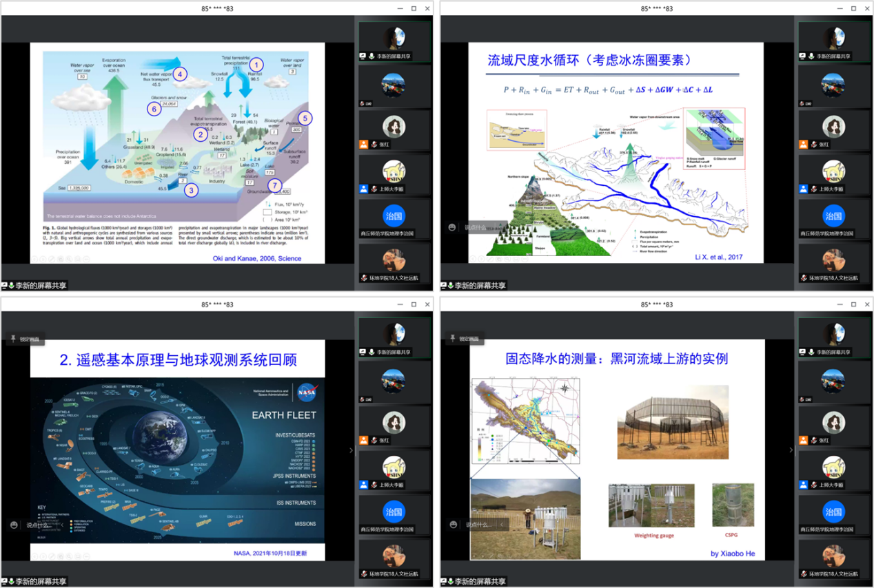 随着遥感技术的不断进步,当前许多陆地水循环变量已经能够借助遥感来进行定量估算。李新教授首先从“陆地水循环”的概念出发,系统介绍了遥感基本原理、地球观测系统的发展历程以及最新成果。随后,他详细阐述了遥感观测降水、蒸散发、土壤水、径流、冰和积雪、地表水、地下水等重要水循环变量的基本原理。李新教授还提到,由于现实真实世界的复杂性,遥感反演还需要大量地面观测数据进行评估和验证,在协同监测中不断优化反演算法、提高反演精度。最后,李新教授结合自身科研经历,以中国典型的内陆河流域——黑河流域开展的大型卫星—航空—地面综合遥感试验为例,重点介绍了遥感在陆地水循环研究中的重要应用,该实验以期能够建立世界领先的流域观测系统、发展流域尺度高分辨率遥感产品、突破遥感尺度转换瓶颈、为实现卫星遥感对流域的动态监测提供方法和范例。在互动交流环节中,同学们围绕“遥感技术对不同地区的观测差异”“观测数据的尺度转化方法”等问题积极请教,李新教授耐心地为同学们解答疑惑,并进而指出了空间对地观测陆地水循环的进一步研究方向。
