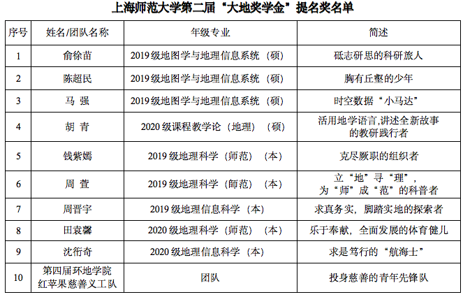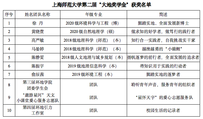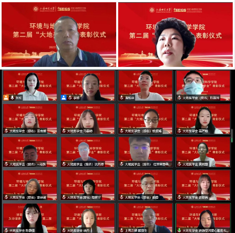 太阳成集团tyc33455cc官网“大地奖学金”由我校86级地理系校友顾登生于2019年发起,91级地理系校友李敏烨、92级地理系校友徐烁共同捐资设立每年度评选一次,主要用于奖励积极践行院训精神,在德智体美劳等各方面表现优秀的地学子第二届“大地奖学金”评选共收到42份申请材料,经材料审核、公开答辩、线上投票,最终16位个人和4个学生团队获评“大地奖学金”及提名奖。
