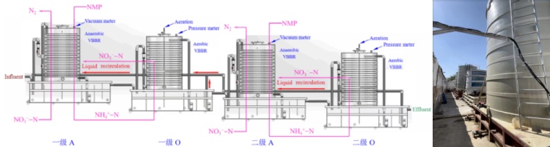 我国每年工业生产过程中所排放的废水量达到近 260 亿吨,其中多数工业废水因其复杂的成分难以通过常规生物处理手段有效降解。特别是对于具备较好生化性的高浓度有机工业废水,尽管传统A/O(厌氧-好氧)工艺常被采用,但其处理效果往往难以达到当前严格的一级A排放标准。鉴于此,该项目创新性地引入了自主研发的垂直折流式生物反应器(VBBR)构筑的无污泥循环的A/O工艺,专门针对N-甲基吡咯烷酮(NMP)生产废水进行处理。经过实际应用验证,该工艺不仅显著提升了废水处理效率,而且出水水质成功达到了国家一级A排放标准,相比传统A/O工艺展现出了更为卓越的性能。