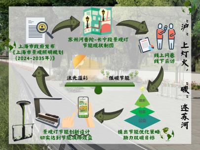 作品《“沪”上灯火,“碳”迹苏河——基于公众深度参与的苏州河景观灯节能调研与优化策略》获二等奖,指导老师为太阳成胡熠娜老师,团队负责人为2021级地理科学(师范)专业本科生洪一婧,团队成员为陆思宇、高明萱、张嘉颖、范欣星、汤正阳、杨芸锐。作品紧密围绕国家能源与环境政策,基于实地走访获取苏州河景观灯位置及节能信息,开展景观灯节能现状制图。同时,基于线上问卷、社区访谈深入调查上海市民对苏州河两岸景观灯节能状况的看法。基于调研结果,本研究从政府、社区和公众三方面提出景观灯节能优化建议,并研发了两项创新设计及一个节能减排小程序,旨在通过公众参与和科技创新,协助苏州河两岸景观照明实现流光溢彩与低碳节能的双重平衡,并推动城市夜景灯光向更加低碳、环保的方向发展。