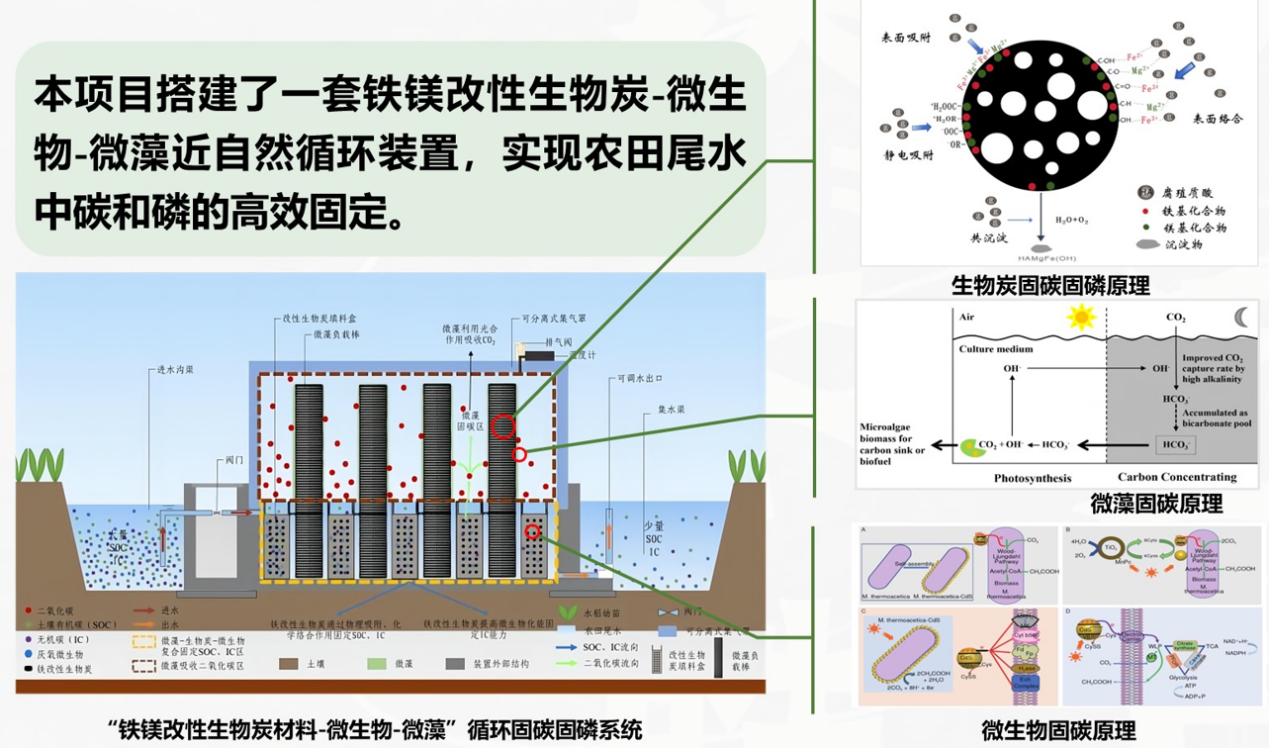 获奖作品《“铁”近自然,“镁”丽田园:一种改性生物碳驱动的农田尾水固碳固磷技术》由孟梁老师担任指导老师,团队成员为张露露、钱嘉伟、方逗逗、汪永康。项目利用铁镁改性的生物炭与尾水中自身含有的微藻和微生物相结合,搭建了一套铁镁改性生物炭材料驱动的微藻微生物联合固碳固磷系统,可以实现“物理-化学-生物”联合固碳和磷。利用双金属改性生物炭,可以实现尾水中C和P的双重高效固定,相比于传统固碳固磷方式,装置进一步提高了系统对土壤养分的固持能力。本装置系统可以很好地控制温室气体的排放,助力我国实现“双碳”目标,为农业农村低碳绿色发展提供技术支持,进一步贯彻落实国家减排固碳政策。