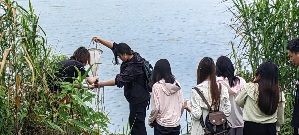 6月24日,同学们来到阳澄湖畔进行水体采样。大家蹲在湿地边缘,手持浮游植物采样网,让其缓缓沉入水中采集浮游植物。在同步进行的土壤采样中,同学们观察到不同土地利用类型的土壤呈现出显著差异:森林土壤呈疏松团粒状、农田土壤结构紧实、湿地土壤呈现暗黑色泽。在随后金鸡湖的采样过程中,同学们也有意外发现:尽管水体透明度较高,但已出现蓝藻聚集的初期迹象,这一发现为区域生态环境预警提供重要监测依据。