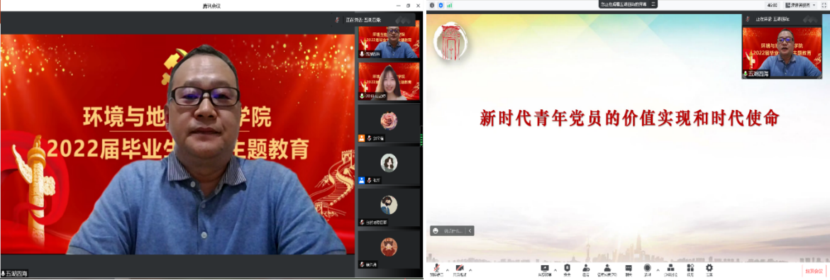 黄辞海老师围绕“新时代青年党员的价值实现与时代使命”为毕业生党员们带来了一堂微党课。党课伊始,本科生2018级党支部马晏婷同志、硕士毕业年级第二党支部张欣伊同志、博士党支部张凯迪同志分别结合自身实际,与大家交流了对于“青年党员的价值与使命”的思考。随后,黄辞海老师从个人价值如何实现出发,结合毕业生党员的青春特性,提出青年党员要敢有自己的价值追求、青年党员要在组织的引领下去锚定个人价值、青年党员要在把握时代脉搏中实践个人价值。黄辞海老师希望毕业生党员要敢梦、寻梦、追梦,让中国梦成为个人梦的底色,让个人梦融入中国梦的整体,并以习近平总书记在中国共青团成立100周年大会上提出的“五个模范”勉励广大毕业生党员:要理想远大、信念坚定;要刻苦学习、锐意创新;要敢于斗争、善于斗争;要艰苦奋斗、无私奉献;要崇德向善、严守纪律。他希望各位党员毕业生们在今后新的岗位上,始终牢记入党誓词,对党忠诚积极工作。同时要始终记住“把论文写在祖国大地上”环地学院院训,只争朝夕,不负韶华,奋力走好新时代的长征路,走好我们每一个人的长征路。最后,黄辞海老师祝愿毕业生党员都能在新时代书写人生的新辉煌。