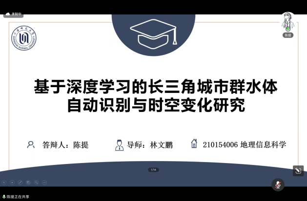 地理科学(师范)专业毕业生汪永康同学以《长三角森林对干热事件的响应研究》为题,构建综合干热指标,结合遥感与实地数据,分析2022年及近二十年干热事件的时空特征,评估不同树种在极端条件下的生理响应差异及结构性特征。地理信息科学专业毕业生陈提同学在《基于深度学习的长三角水体识别》研究中,提出一种新型水体标签生成算法,缓解样本短缺问题,并采用“双教师知识蒸馏”U-Net模型,增强模型的泛化能力与自动化水平。人文地理与城乡规划专业毕业生梁煦婧同学从家庭视角出发,基于2016、2018年中国劳动力动态调查数据,探讨地理环境、交通通勤及社会人口因素对工作满意度的直接与间接影响,并分析夫妻间关系在其中的作用。环境工程专业毕业生凌子健同学聚焦抗生素污染问题,在《氧化银-硫化锌异质结光催化降解抗生素》中成功制备管状异质结材料,系统评估其在可见光下对四环素的降解性能。