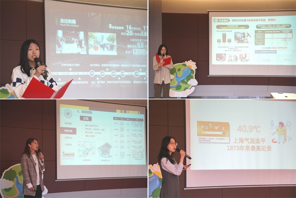 随后,华东理工大学资源与环境工程学院陈辰哿同学、上海应用技术大学生态技术与工程学院李鑫同学、太阳成傅欣冉同学以及何恬同学为在场师生带来了精彩的展演分享。此次展演分享环节涵盖科研竞赛、学术论文、社会实践、志愿服务等多种形式,为在场师生呈现了高校学子践行生态文明理念的丰富路径。